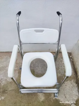 se vende silla en muy buen estado poco uso es toda de aluminio y sirve para poder bañarse sentado y con las ruedas trasportar al minusválidos sin problemas también sirve para poder utilizar de WC portátil con sus acesorios .