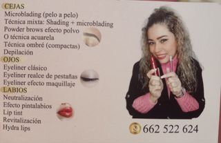 aprovecha esta oportunidad para microblading, (cejas pelo a pelo), sheiding, micropigmentación labios, tan de moda en la actualidad, realza tú imagen, pide cita al teléfono 630456520