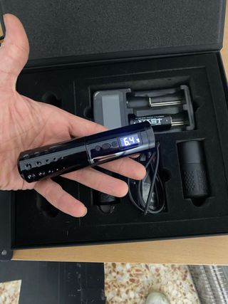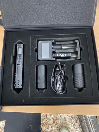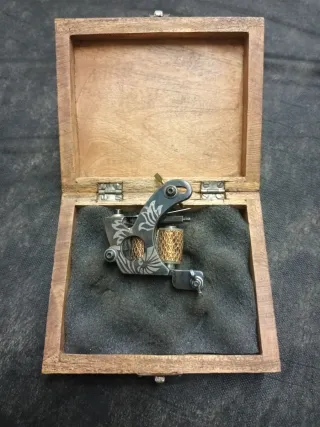 Maquina de tatuar de bobinas con caja de madera.