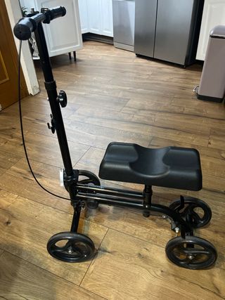 Andador de rodilla para aliviar la presión en brazos y manos durante desplazamientos largos. Estructura plegable para poder transportarlo en el maletero del coche. Rodillera y manillar regulable en altura para adaptarse a las necesidades del usuario. Sus ruedas facilitan un movimiento fluido y estable. freno situado en la empuñadura para bloquear el andador con facilidad. Peso máx. 136 kg