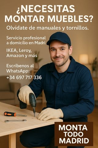 Hola 👋, me ofrezco para realizar trabajos de montaje de muebles en casa o domicilio: ✅ Armarios ✅ Escritorios ✅ Estanterías ✅ Camas y literas ✅ Cómodas y zapateros ✅ Muebles de IKEA, Leroy Merlin, Amazon, etc. También puedo ayudar con desmontaje si hace falta. 🔹 Trabajo limpio, serio y sin complicaciones 🔹 Presupuesto sin compromiso 🔹 Me adapto a lo que necesites 🔹 Zona: Madrid y alrededores 📲 Escríbeme por WhatsApp o mensaje y dime qué mueble es y dónde está ¡Te doy precio rápido! 😉