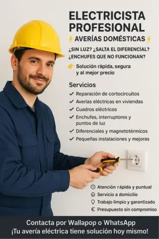 Reparaciones y Mantenimiento Eléctricos. ¿Necesitas un electricista de confianza? ¡Estoy aquí para ayudarte! Ofrezco servicios profesionales de: • Instalacion y reparaciones de cableado eléctricos • Mantenimiento de instalaciones eléctricas • Solucion de cortocircuitos y fallos eléctricos • Instalacion de iluminación • Instalacion y reparaciones de aires acondicionados Garantizo un trabajo seguro y eficiente. Comprometido a ofrecer servicios de calidad con atención personalizada. Instalaciones, reparaciones y mantenimiento eléctrico a precios accesibles. ¡Contáctame para un presupuesto sin compromiso!" Telf: 621205407