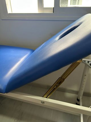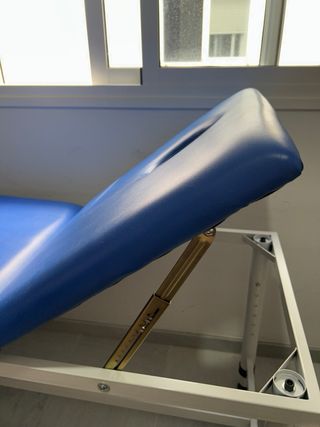 Camilla prácticamente nueva. Fija de acero (en blanco) de 2 cuerpos ligereza, versátil y que cuenta con respaldo regulable, orificio y tapón facial. Regalo sábanas ajustables desechables y cojines de media luna para apoyo de cabeza o piernas.