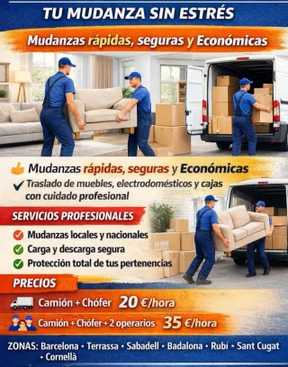 🚚 JON MUDANZAS – TU MUDANZA SIN ESTRÉS 🚚 ¿Planeando mudarte en Barcelona o alrededores? Con Jon Mudanzas, tu mudanza será rápida, segura y económica. Nuestro equipo profesional se encarga de muebles, electrodomésticos y cajas con máximo cuidado. 🏠➡️🏡 💪 Servicios que ofrecemos ✔ Mudanzas locales y nacionales ✔ Carga y descarga profesional ✔ Protección completa de tus pertenencias ✔ Atención rápida por WhatsApp o llamada ✔ Personal capacitado y responsable 💰 Tarifas claras 🚚 Camión + chófer: 20 €/hora 🚚👷♂️👷♀️ Camión + chófer + 2 operarios: 35 €/hora 📍 Zonas de servicio Barcelona, Terrassa, Sabadell, Badalona, Rubí,