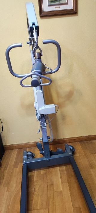 Grúa eléctrica con batería recargable. Soporta máximo 150 kg. Incluye arnés. Puede plegarse para ocupar menos espacio. Las patas se pueden abrir y cerrar para pasar por las puertas. Con libro de instrucciones.