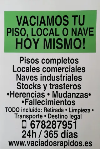 ¡VACIAMOS TU PISO, LOCAL O NAVE HOY MISMO! ● Pisos completos ● Locales comerciales ● Naves industriales ● Stocks y trasteros ● Herencias • Mudanzas • Fallecimientos ● Reformas previas TODO incluido: Retirada • Limpieza • Transporte • Destino legal ¡PRESUPUESTO GRATIS EN 15 MINUTOS! 📞 678287951 24h / 365 días Vaciados Rápidos