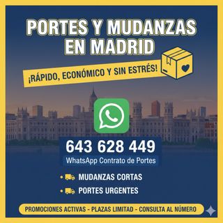 🚀 PORTES MADRID: ¡BARATO, RÁPIDO Y HOY! ¿Buscas una solución fácil? Me encargo de todo. Servicio de confianza en furgoneta mediana para mudanzas cortas y traslados urgentes. 📦 LO QUE NECESITAS, YA: • Capacidad: Hasta 9 \bm{m^3} (Cabe sofá, cama, cajas y más). • Zona: Todo Madrid y alrededores. • Confianza: Contrato de portes y presupuesto cerrado. ⚠️ ¡OFERTA ESTA SEMANA! Consultando por WhatsApp: Plazas Limitadas. 📞 ESCRIBE O LLAMA YA: 👉 643 628 449 (WhatsApp directo)