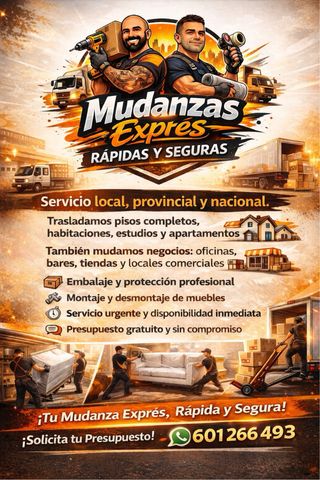 🚚 Mudanzas Exprés rápidas y seguras Servicio local, provincial y nacional. Trasladamos pisos completos, habitaciones, estudios y apartamentos 🏠 También mudamos negocios: oficinas, bares, tiendas y locales comerciales 🏪 📦 Embalaje y protección profesional 🔧 Montaje y desmontaje de muebles ⏱️ Servicio urgente y disponibilidad inmediata 💬 Presupuesto gratuito y sin compromiso