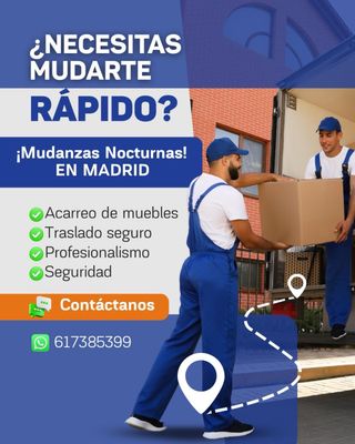 Mudanzas-portes --dentro de Madrid solo transporte (M40) 50€ para otras zonas consulta presupuesto gratis . -Si necesitas armar -apañar/ reparar muebles , canapés, mesas. Ofrecemos servicio también de manitas -contamos con personal cualificado. -Vaciamos tu trastero y llevamos todo a un punto limpio . -También te ayudamos a preparar y organizar tu mudanza . -Somos profesionales , puntuales y responsables con el cuidado de las mercancías. -Envíos urgentes 24/7 Consúltanos.