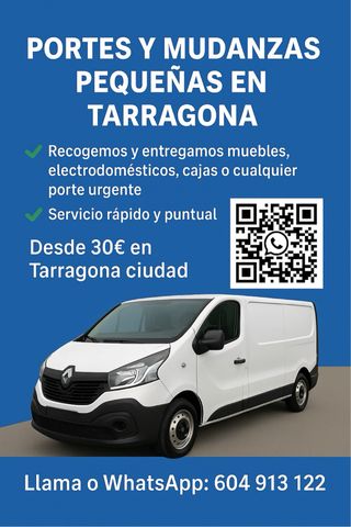 📢 DISPONIBLE HOY para portes en Tarragona y alrededores 🚚 Recogidas y entregas rápidas 📦 Muebles, electrodomésticos, paquetes grandes 💰 Tarifas claras – desde 30€ 📲 Reserva ahora por WhatsApp: 604 913 122