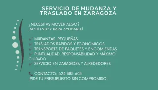 Buscas una mudanza económica y profesional en Zaragoza? Ofrezco servicios de mudanzas pequeñas y medianas, recogida y entrega de muebles (IKEA, Leroy Merlin, Wallapop, etc.), traslados de trasteros u oficinas y reparto puntual o regular para empresas. Disponibilidad flexible y factura disponible. Contacta para más información.!!