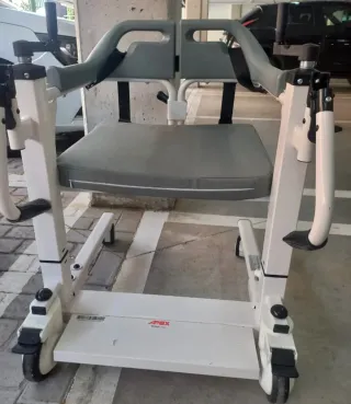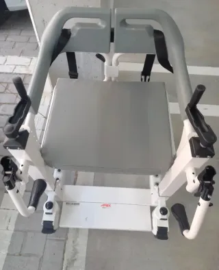 Esta es una silla de transferencia y ducha impermeable Apex Easy Move. Multifuncional: Diseñada como silla de transferencia, para ducha, e inodoro (WC). Seguridad: Cuenta con doble sistema de bloqueo, cinturón de seguridad y frenos en las cuatro ruedas. Transferencia fácil: Su apertura de 180º facilita la colocación y el traslado del usuario minimizando el esfuerzo del cuidador. Materiales: Fabricada en acero inoxidable con asiento y respaldo de poliuretano para uso en ambientes húmedos. Largo: 71 cm Ancho: 60 cm Alto (ajustable): 79 a 90 cm