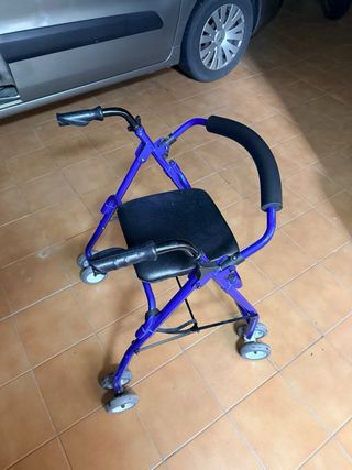 Andador con asiento y respaldo acolchado, ligero pero robusto. Con ruedas en las patas delanteras y traseras para poder ir por la calle con comodidad. Plegable