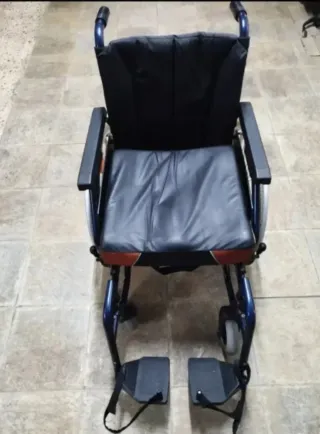 Silla de ruedas de aluminio color azul marino y negro, incluye cojin antiescaras, perfecto estado.