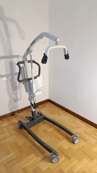 Grúa para manejo de personas mayores con movilidad reducida y/o totalmente dependientes. Como nueva (aún tiene algunos plásticos del embalaje de fábrica). No se ha llegado a usar y es más, se compró otro arnés más valorado en 150 euros que tampoco llegó a utilizarse, o sea, nuevo directo de la ortopedia.