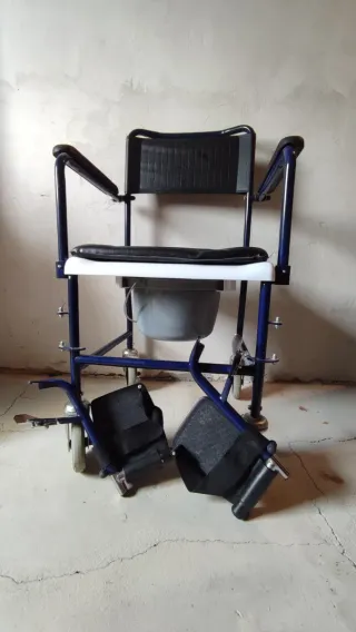 Silla de ruedas acolchada para ducha y WC Aston. Muy buen estado, tal cual se ve en las fotos. Muy ligera y fácil de llevar. Entra perfectamente por puertas y pasillos estándar. Con cubeta incluida. Se puede usar como inodoro o sobre el inodoro directamente tambien. Asiento y respaldo de poliuretano, muy fácil de limpiar. Reposabrazos abatibles. Reposapiés abatibles y regulables en altura, también extraíbles. Ruedas direccionables con frenos. Con instrucciones. A recoger en San Sebastián.