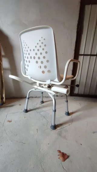 Silla para personas con movilidad reducida, en plástico blanco y metal. Tiene uno de los extremos roto, aunque no afecta a su uso.