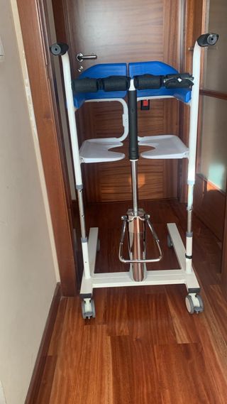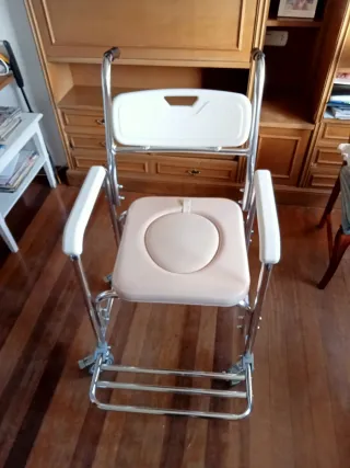 Silla sanitaria para duchar personas sin mobilidad. Practicamente nueva, muy poco uso. Con todos los complementos, urinario con tapa y reposapies. Está silla permite asear a personas dependientes de forma fácil.