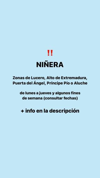 Mi nombre es Cristina y actualmente estoy en segundo del Doble Grado en Economía y Periodismo. Soy una chica educada y muy responsable. Ademas, me encantan los niños. Busco trabajar de niñera. Puedo cuidar a los niños en casa, recogerlos del cole, salir a pasear con ellos, darles la merienda, etc. Preferiblemente barrio lucero, aunque también algo de Extremadura, puerta del ángel, príncipe Pío o Aluche. Los días disponibles son de lunes a jueves, aunque tengo disponibilidad algunos fines de semana. El precio por hora es de 13€ entre semana y 15€ los fines de semana.