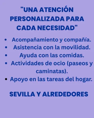 Soy Alicia, sevillana y tengo 53 años. Me ofrezco como cuidadora y ayuda a domicilio. Tengo experiencia, y soy responsable, atenta y cariñosa en mi trabajo. También acompaño y atiendo a pacientes hospitalizados. Disponibilidad diurna y nocturna. Tengo vehículo propio y solo trabajo en Sevilla capital. No duden en consultar cualquier necesidad o duda.