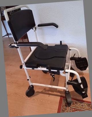 Puede utilizarse directamente sobre el inodoro haciendo funciones de elevador de WC. Al disponer de cubeta, también se puede usar en cualquier parte del hogar. Estructura de aluminio. Para la parte trasera, incluye ruedas pequeñas (120mm) para movilidad asistida o grandes (600mm) para autodesplazamiento. Dispone de cubeta y reposapiés de plástico. Centro del asiento desmontable, reposabrazos abatibles. Peso máximo del usuario: 100 Kg. Entrega en Torrejón de Ardoz o sus cercanías. No hago envío de este artículo.
