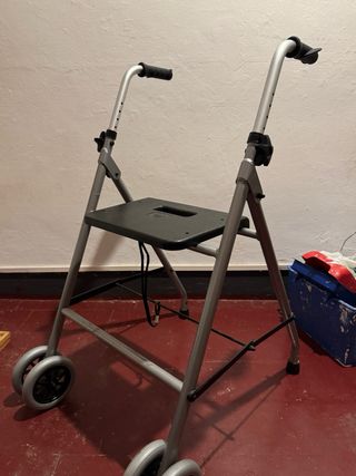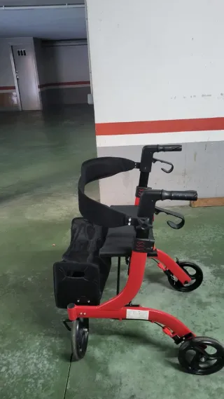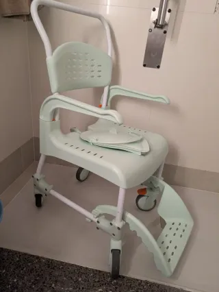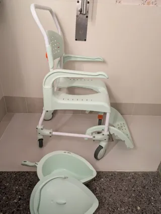 Se trata de una silla de ruedas para la higiene en la ducha de personas con problemas de movilidad. Tiene reposapiés ajustable y un orinal que se puede retirar si no se considera necesario. Está en buenas condiciones ya que se ha usado poco tiempo