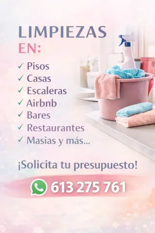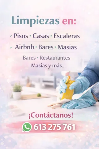Somos dos personas dedicadas a ofrecer un servicio de limpieza de calidad directamente en tu hogar. Una de nosotras cuenta con amplia experiencia en el sector, lo que nos permite garantizar un trabajo eficiente, detallado y adaptado a tus necesidades. ¿Qué ofrecemos? •Limpieza general y profunda •Mantenimiento semanal, quincenal o puntual •Limpieza de cocina, baños, suelos y ventanas •Organización básica del hogar Por qué escogernos: •Somos profesionales, serias y cuidadosas •Actuamos con responsabilidad y respeto en cada hogar •Tenemos ganas de aprender y mejorar constantemente •Puntualidad y nos adaptamos a horarios