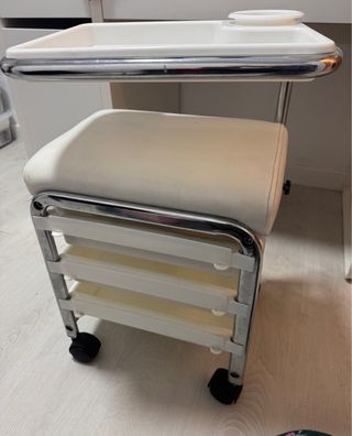 Carro de pedicura blanco y plateado, con parte de sillón acolchada.