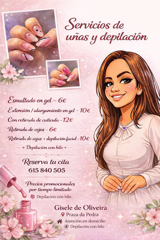 ¡Mima tus manos y pies sin salir de casa! ✨ Soy profesional en uñas y cuidado estético, ofrezco servicio a domicilio en La Coruña con materiales de alta calidad y máxima higiene. Servicios y precios: ✔ Manicura semipermanente – 15 € ✔ Alargamiento en gel – 30 € ✔ Nivelación – 25 € ✔ Pedicura spa – 25 € ✔ Pedicura en seco – 20 € 📍 Solo a domicilio – La Coruña y alrededores. 📞 Citas y consultas por WhatsApp o llamada: 643 73 79 17 Resultados profesionales, diseños personalizados y atención cuidada 💖 ¡Agenda tu cita sin compromiso!
