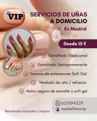 ✨ Belleza a Domicilio en Valencia ✨ Un servicio exclusivo y personalizado donde la calidad, el detalle y la comodidad van primero. 💅 Manicura y pedicura profesional, semipermanente, gel y diseños a medida, realizados con productos de alta gama y estándares de higiene impecables. Disfruta de una experiencia de belleza privada sin salir de casa. Elegancia, profesionalismo y dedicación solo para ti. 📩 Reserva tu cita.