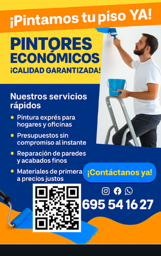 ¿Quieres renovar tu casa sin hacer obras? Ofrecemos servicio completo de pintura para piso, casa, chalet, local, etc. Trabajos rápidos, limpios y con acabados profesionales 🔹Pintura de interiores y exteriores 🔹Colores lisos, decorativos, estuco o efecto especial 🔹Papel pintado decorativo 🔹Reparación de grietas y humedades 🔹Pintura de techos, paredes, puertas y ventanas 🔹Asesoramiento en colores y acabados 🔹Uso de materiales de calidad (Titan, Bruguer, etc.) ✅ Limpieza al terminar ✅ Seriedad y puntualidad ✅ Presupuesto sin compromiso ✅ Precios económicos ✅ Atención personalizada Contáctanos y pide presupuesto sin compromiso