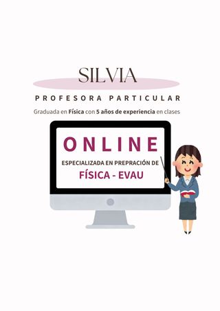 Aprender sin reflexionar es malgastar la energía. ¡Hola! Soy Silvia, graduada en Física. Ofrezco clases online de refuerzo para preparar la EVAU de Física! Cuento con 5 años de experiencia. 🧠 13,25 en la EVAU 🎓 Nota media: 9,1 en la carrera Mejor expediente de la promoción 🏅 Mención honorífica en Bachillerato 💻 Online 💬 B2 inglés, A2 francés 💸 Desde 20€ Desliza la imagen para ver opiniones de mis alumnos y sus papis :) Hablamos?