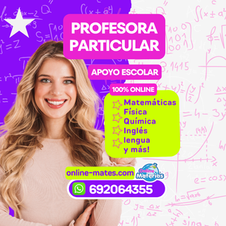¿Necesitas apoyo? Soy profesora particular especializada en apoyo escolar para todos los niveles de la eso 📘 Clases de física, matemáticas, química, biología, lengua, inglés, francés y más 📚Refuerzo Escolar todo el año, vacaciones, clases de emergencia para exámenes, deberes, tareas, dudas de materias y ayuda en general. Primaria y ESO : 12€/h 📝 Clases sueltas 📚Pack de 8 horas 80€ (10€/h) 🤩 1° y 2° BACHILLER, SELECTIVIDAD: 14€/h 📝 Clases sueltas 📚Pack de 8 horas 100€ (12.5€/h) 🕐¡Escoge tus horarios y días para las clases! ¡Te ofrecemos Flexibilidad! ¡CONTÁCTANOS! 📲 WhatsApp: 692 064 355 🌐 online-mates.com
