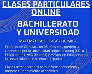 ESO / Bachillerato / Universidad. 📚 Matemáticas · Física · Química. 👋🏻Hola, soy Alex Profesor con más de 25 años de experiencia. Licenciado en Ciencias por Brigham Young University (EE. UU.), Físico por la UNED, Máster en Educación por la Universitat de Barcelona y divulgador científico en Utrecht University (The Netherlands). ✅ Método claro y riguroso. ✅ Material de apoyo: resúmenes, simulacros y vídeos. ✅ Resultados demostrados en exámenes y recuperaciones. 📅 Disponibilidad: martes, jueves, sábados y domingos. 💰 ESO: 15€/h Bachillerato: 17€/h Universidad: 20€/h 📲 WhatsApp: 616 899 338
