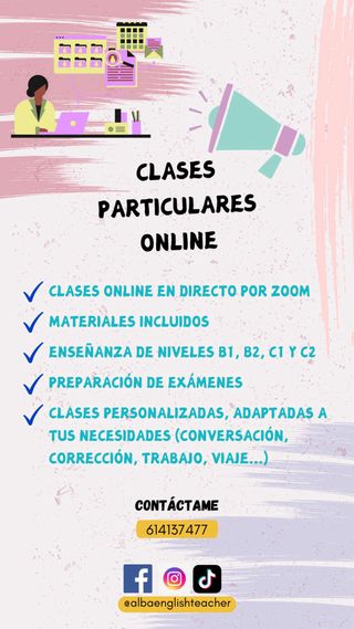 Hello there! Estudié el grado en Estudios Ingleses y el máster de profesorado, y tengo más de 10 años de experiencia dando clase y en concreto preparando alumnos para conseguir su título B1, B2 y C1 de Aptis. Puedo ayudarte a aprender inglés, a reforzarlo o a practicarlo en los diferentes niveles, y también a preparar las diferentes partes del examen de Aptis. Me gusta mucho trabajar con materiales personalizados, preparo las clases individualmente y con mimo para hacer el aprendizaje lo más ameno posible. También hago cursos mensuales online en directo y en diferido Conóceme en mis redes sociales @albaenglishteacher 614137477