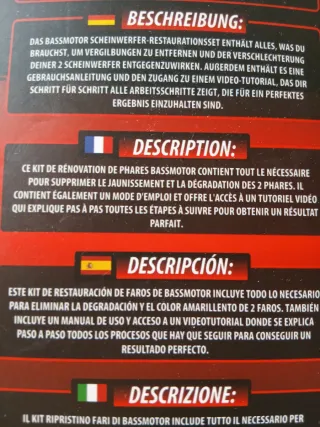 Kit para pulido de faros. Marca Bassmotor. Precio nuevo 19,99 euros. Sin utilizar aunque envoltorio abierto. Necesario atornillador,taladro,pulidora,etc capaz de realizar proceso 500-900 revoluciones( según instrucciones). Enlace QR a tutorial