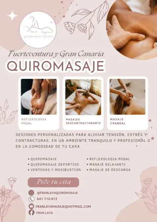 🌴 QUIROMASAJE RELAJANTE EN GRAN CANARIA Y FUERTEVENTURA 🌴 💆♂️ Regálate un momento de paz y desconexión total. Sesiones personalizadas para aliviar tensión, estrés y contracturas, en un ambiente tranquilo y profesional. ✨ Tarifas: 💶 50 € — 60 minutos de masaje relajante integral 💶 80 € — 90 minutos para una experiencia profunda y completa 📍 Ubicación: Gran Canaria y Fuerteventura 📅 Cita previa — atención individual y personalizada 📲 Reserva tu sesión por WhatsApp o llamada al teléfono 641710813 🕊️ Tu cuerpo lo agradecerá, tu mente también.