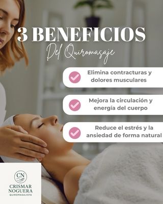 💆♀️ Quiromasajista profesional Soy quiromasajista profesional y trabajo con diferentes técnicas de masaje, adaptadas a las necesidades de cada cliente. Mi enfoque se basa en el bienestar, la armonía y el equilibrio cuerpo-mente, ofreciendo sesiones personalizadas para aliviar tensiones, reducir el estrés y mejorar tu bienestar general. ✨ Los precios varían según el tipo de masaje. Consúltame sin compromiso.