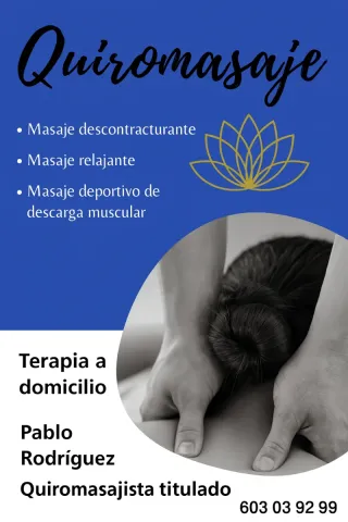 Quiromasajista profesional y masajista deportivo. Masaje descontracturante, relajante, circulatorio, post- entrenamiento, deportivo, estiramientos, aliviar la tensión del día a día. Duración: 1 hora 30€. 90 minutos 45€. A domicilio consultar precio. Masaje en camilla o en futón. -Masaje anticelulítico (consultar precio) Horario, De lunes a viernes laborables a partir de las 18:00h. Sábados, domingos y festivos todo el día. WhatsApp 613 38 45 95 Se pide seriedad.
