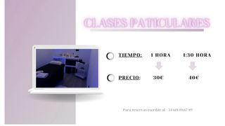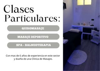 Clases Particulares de: • Quiromasaje • Masaje Deportivo • Spa y Balneoterapia • Masaje Craneal Al finalizar los talleres se les dará un certificado firmado por la clinica, que lo enviaremos vía mail. Tanto las clases particulares como los talleres, serán realizados en una Clinica de Masajes situada en Alcorcon. Seran dirigidos por la dueña de la Clinica, la cual lleva mas de 6 años de experiencia en este sector. ¿Y el horario de las clases particulares? Martes / Miércoles / Jueves De mañana y de tarde. ¿Horario de los talleres? A consultar. Cualquier duda o información, por privado!