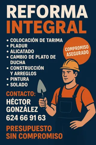 ¿Necesitas renovar tu espacio? Soy profesional con amplia experiencia en: Suelos: Instalación de tarima, laminados y vinílicos. Pladur: Tabiques, trasdosados y techos con acabados perfectos. Fontanería: Instalaciones, averías y cambios de sanitarios. Baños y Cocinas: Reformas integrales o parciales de alta calidad. Garantizo limpieza, rapidez y precios competitivos. Pide tu presupuesto sin compromiso enviándome un mensaje. ¡Trabajos garantizados!