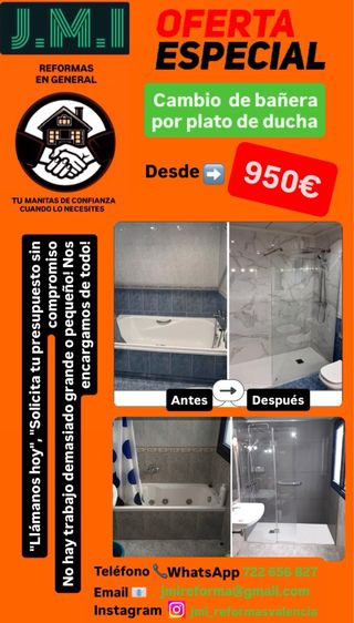Transformamos su baño y cocina con eficiencia y excelencia, respaldados por más de 15 años de experiencia en reformas integrales. Servicios incluidos: 1. Demoliciones y retirada de escombros 🏗️ 2. Instalación de fontanería 🚰 3. Trabajos eléctricos ⚡ 4. Colocación de pavimentos y revestimientos 🛠️ 5. Instalación de techo de pladur 🏠 6. Montaje e instalación de muebles, electrodomésticos, inodoro, plato de ducha, grifería y mampara 🛁 Precio de reforma de baño (obra + materiales): desde 3500 euros. La reforma de cocina (solo mano de obra) inicia en 2500 euros. ¡Solicite su presupuesto sin compromiso! 😊 623 25 48 20 (Whatsapp)