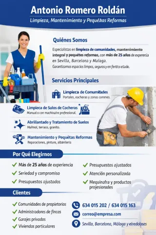 Empresa especializada en limpieza de comunidades, mantenimiento integral y pequeñas reformas. - Más de 25 años de experiencia. - Presupuestos ajustados y atención personalizada. - Limpieza de comunidades, portales y zonas comunes. - Limpieza de garajes y suelos. - Tratamiento de suelos (mármol, terrazo, granito). - Pequeñas reformas, reparaciones, pintura y albañilería.