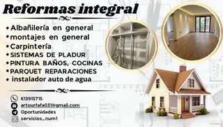 🔨 REFORMAS INTEGRALES - Tu proyecto en buenas manos Especialistas en reformar tu hogar de principio a fin: 🛁 Baños modernos y funcionales 🍳 Cocinas a medida 🎨 Pintura interior/exterior ⚡ Instalaciones eléctricas 🚰 Fontanería 🪵 Carpintería y tarimas 🧱 Tabiquería y obra seca ✨ ¿Por qué elegirnos? - Presupuesto gratuito y detallado - Experiencia demostrable - Limpieza diaria de la obra - Acabados impecables - Asesoramiento personalizado Convertimos tus ideas en realidad. Pequeñas y grandes reformas.