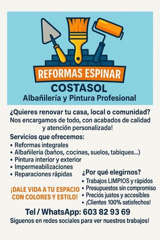 Empresa profesional de reformas y construcción. Realizamos: • Reformas integrales de pisos y casas • Pladur, techos y tabiques • Alicatado y solado • Baños y cocinas • Enlucido, yeso y acabados finos • Electricidad y fontanería básica ✔ Equipo propio ✔ Herramientas profesionales ✔ Experiencia demostrable (ver fotos reales) ✔ Trabajo limpio y responsable 📍 Trabajamos en Málaga, Marbella, Estepona y Fuengirola 📩 Realizamos: • Reformas integrales de pisos y casas • Pladur, techos y tabiques • Alicatado y solado • Baños y cocinas • Enlucido, yeso y acabados finos • Electricidad y fontanería básica ✔