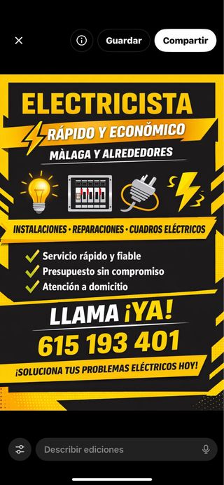 Soy Juan Manuel Ramírez, electricista profesional en Málaga. Realizo instalaciones, reparaciones, reformas integrales, montaje de cuadros eléctricos y actualizaciones de instalaciones nuevas. También arreglo enchufes, luces, interruptores y pequeños electrodomésticos. ✅ Servicio rápido, confiable y económico ✅ Presupuesto sin compromiso ✅ Atención inmediata y disponibilidad a domicilio 📱 Llama o envía WhatsApp al 615 193 401 y soluciona tus problemas eléctricos hoy mismo.