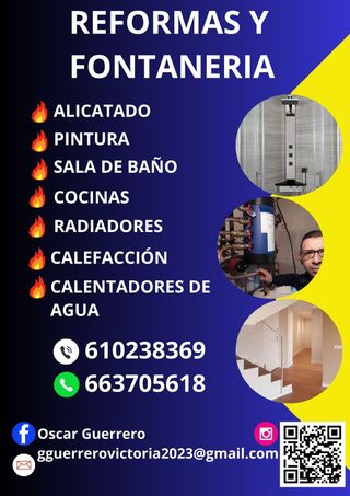 🛠️ Reformas en General – ¡Tu hogar en buenas manos! ¿Quieres renovar tu casa, piso, local o negocio? Ofrecemos servicios integrales de reformas con garantía de calidad y seriedad: ✅ Albañilería ✅ Pintura y alisado de paredes ✅ Fontanería y electricidad ✅ Carpintería y montaje ✅ Suelos y alicatados ✅ Reformas completas de cocinas y baños ✅ Pladur 👷♂️ Trabajos profesionales, rápido y limpio. 📅 Presupuestos sin compromiso. 💰 Precios justos y adaptados a tu necesidad. 📞 Contactenos y transforma tu espacio con confianza. [ 611 874 810 ]
