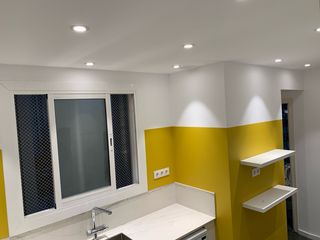 Cocina reformada con un diseño moderno y actual. El espacio se caracteriza por su luminosidad y la combinación de colores blanco y amarillo. - Muebles de cocina blancos en perfecto estado. - Encimeras de color blanco. - Paredes pintadas en blanco y amarillo. - Fregadero de acero inoxidable. - Lavavajillas integrado.