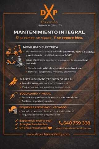 🔧⚡ DXP Servicios – Mantenimiento integral sin chapuzas Somos DXP Urban Mobility y ofrecemos DXP Servicios, una línea de mantenimiento y reparaciones para empresas y particulares. ✔ Movilidad eléctrica: patinetes, bicicletas, motos eléctricas, carritos de golf y VMP ✔ Electrónica y aparatos electrónicos ✔ Electricidad, iluminación y mantenimiento general ✔ Soldadura y metal ✔ Pequeñas reformas, tabiques, vaciados y desescombros ✔ Portes y apoyo logístico 📌 Si se rompe, se repara. Y se repara bien. 📞 Contacto: 640 759 338