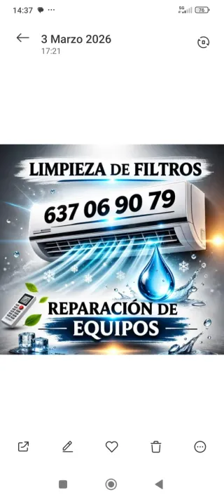 Servicios de limpieza y reparación para equipos de aire acondicionado. También ofrecemos mantenimiento preventivo para asegurar el óptimo funcionamiento de tu sistema. - Limpieza de filtros. - Reparación de equipos. - Mantenimiento general. ALFREDO GONZALEZ REPARASAT TLFNO 637/06/90/79